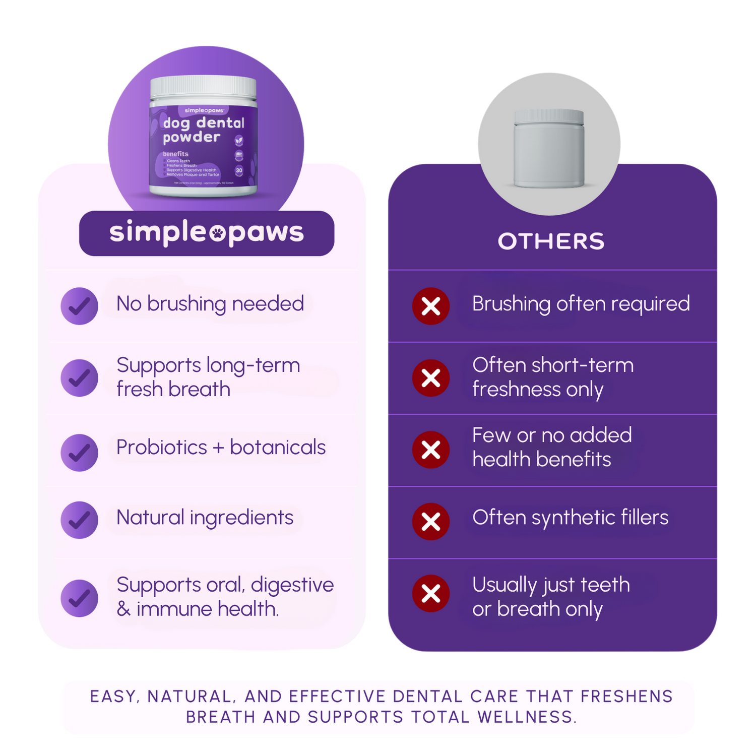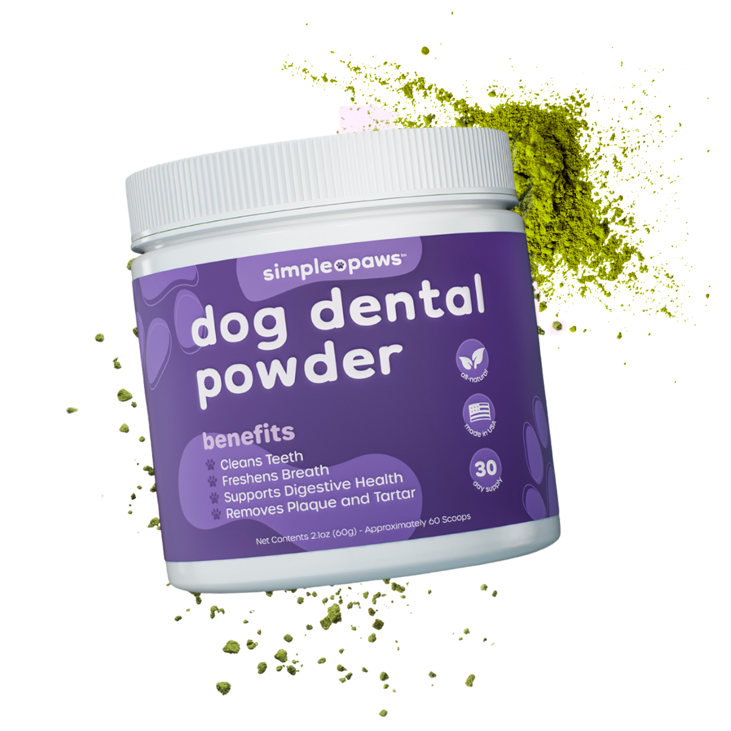 Choosing SimplePaws means giving your dog more than just fresh breath. Our all-natural dental powder supports clean teeth, healthy gums, digestive health, and a healthy immune system. Unlike products with harsh fillers, SimplePaws is formulated for everyday use - delivering simple, stress-free wellness without brushing.